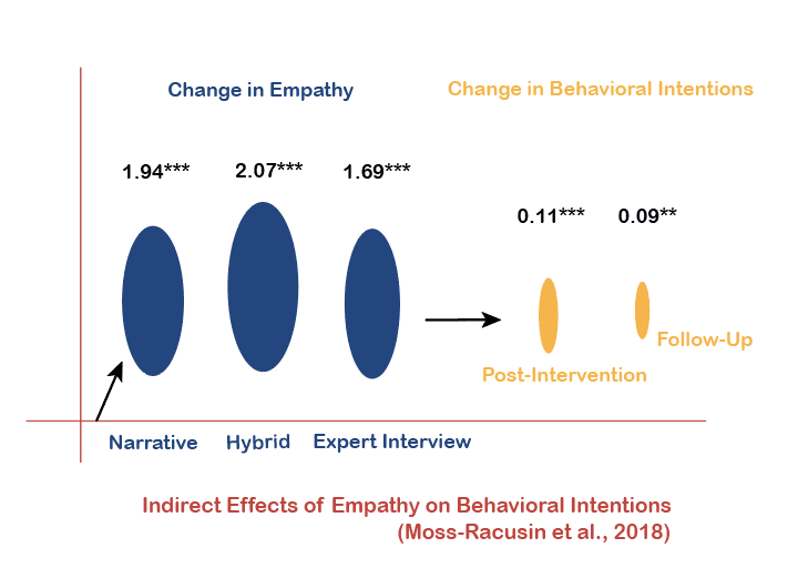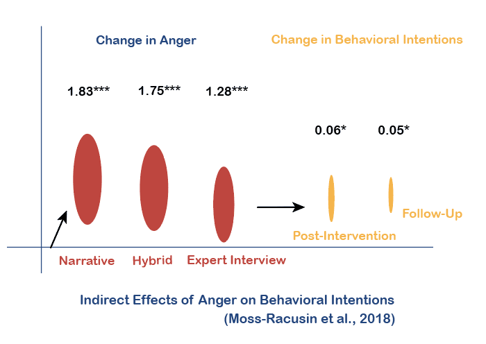 Moss-Racusin et al. (2018) conducted an empirical study demonstrated that three type of VIDS (narrative, expert interview, hybrid) all have a positive impact on intervening in gender bias in STEM fields. Specifically, it affects the subjects’ emotions of empathy and anger towards gender prejudice, and subsequently can influence their behavioral intentions, and it is persistent (Figure7-8).