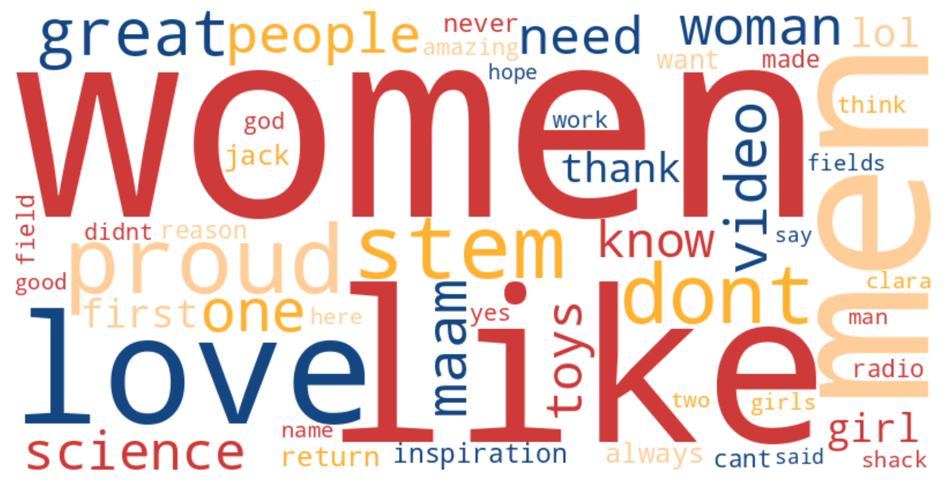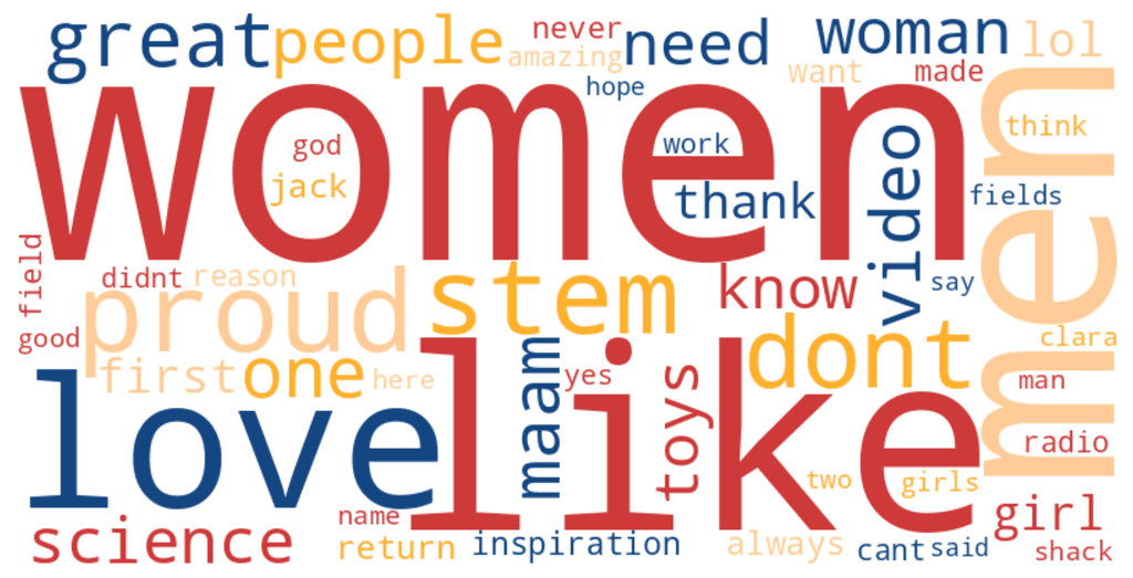 We utilized Octoparse to scrape comments from the top 20 most popular YouTube intervention videos retrieved using the keyword “Women in STEM.” The collected data underwent a thorough cleaning process, during which blank lines, conjunctions, whitespace symbols, personal names, and other non-substantive tokens were removed. After preprocessing, a total of 587 valid comments were retained. Based on a frequency analysis, the top 50 most frequently occurring words were identified and visualized using a word cloud to highlight the dominant themes within the dataset.