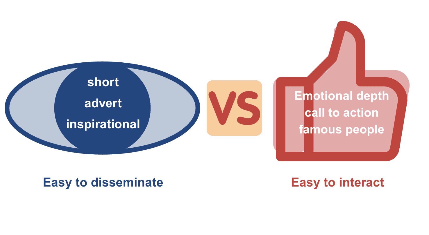 b. In contrast, videos with high numbers of likes are more likely to feature emotional depth, strong calls to action, and appearances by well-known figures, thereby offering greater interactive and affective value to viewers.